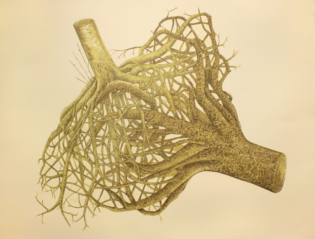 “I have always been drawn to trees. My family taught me to cherish them, and today, as an artist, they continue to hold my gaze. In February 2024, my friends and I trekked into the woods. The four of us shared a small off-grid cabin in Hall’s Harbour and a profound affection for the forest. Each day we hiked through -30 degree weather, engaging with the forest, scanning for the sublime. A pair of trees uprooted in a storm kept bringing me back. Their roots tangled underground, one taking the other down as it fell. I sat in the snow studying them, my hands freezing as I drew. I gave them stories in my head: they were rivals who fought each other to their mutual demise, they were lovers in their death throes, choosing to be together forever. Back in the cabin, my mind lingered on their fused limbs. I imagined them becoming one, anastomosing. In biology, anastomosis is a connection that transfers information and nutrients between otherwise divergent structures. For plants and fungi, this often occurs underground, with whole forests communicating through mycelium. These two connected intimately, their personal exchanges violently exposed by environmental destruction.